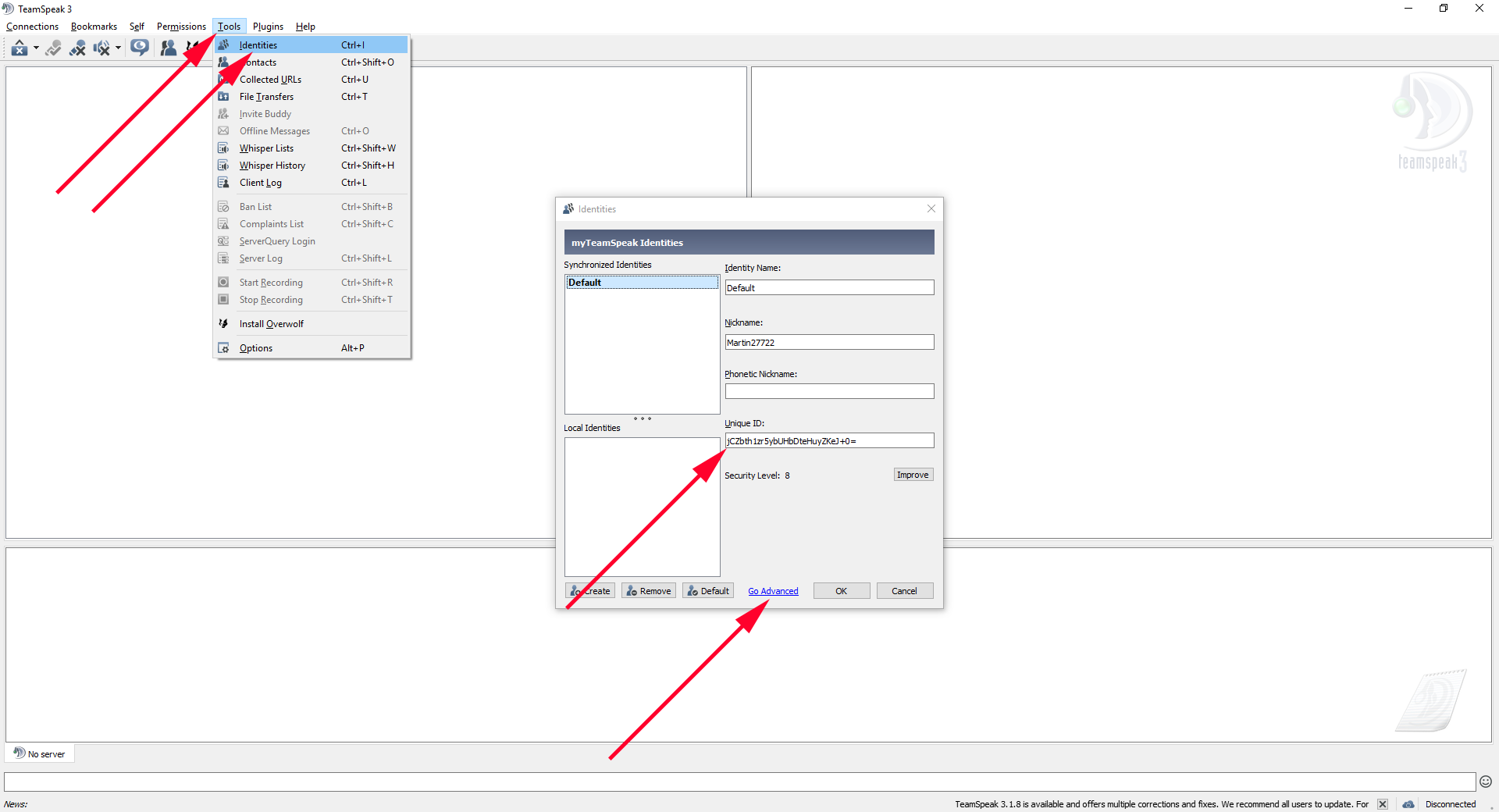 Otevři si TeamSpeak a v horní liště vyber Tools -> Identities nebo můžeš použít klávesovou zkratku Ctrl + I.
