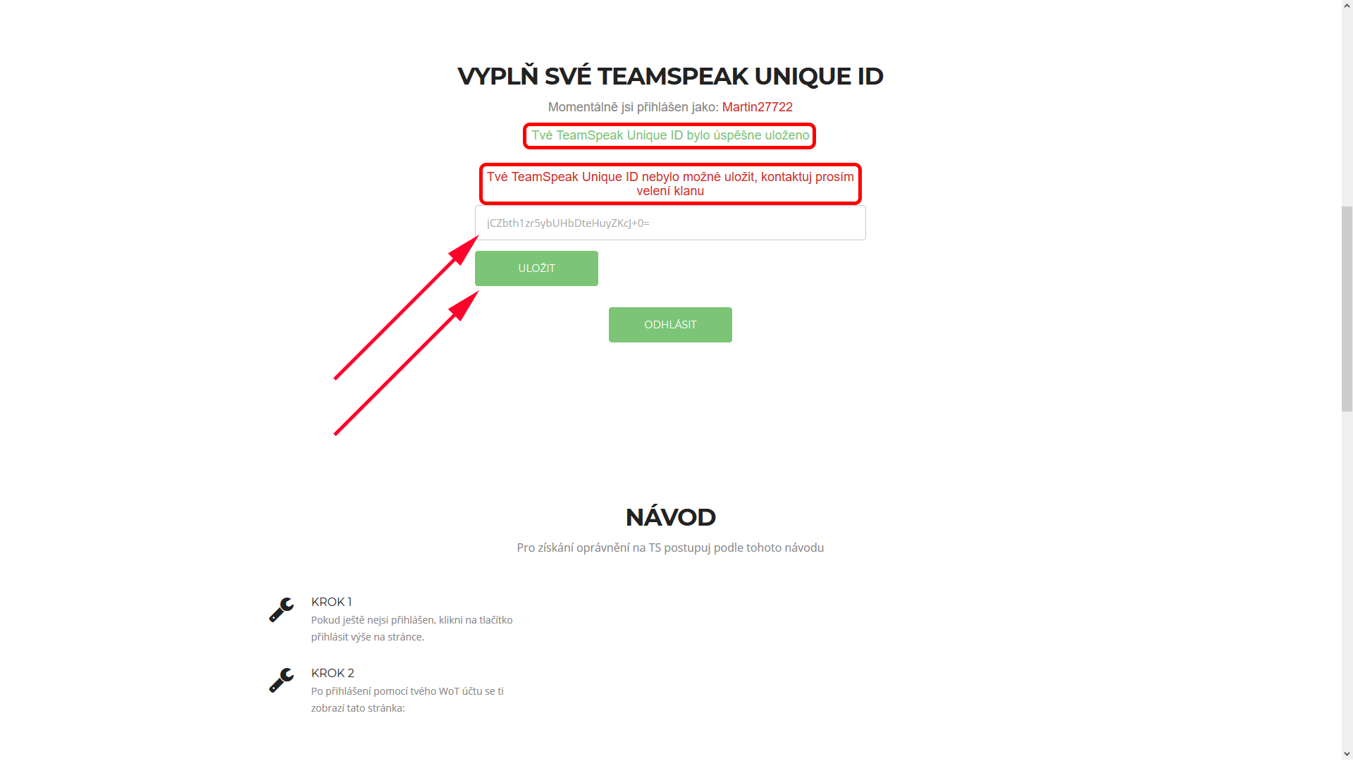 V případě že Unique ID nebylo uloženo, nebo máš nějaký jiný problém, kontaktuj prosím někoho z vedení klanu.